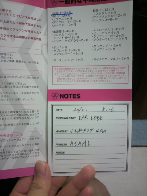 ラージホールのピアッシングの場合流血することがあるらしく帰り際に数枚紙を手渡されました。気付かないうちに首筋を真っ赤な液体が伝ってるんだそうですが何それ怖い((((;゚Д゚))))gkbr