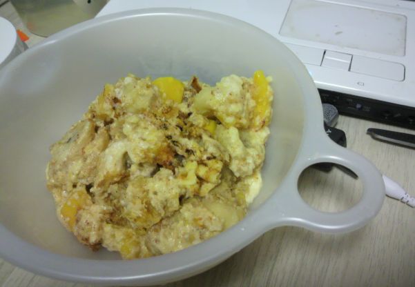 1. バナナをなんちゃって賽の目切りにして、バターで炒める(シナモンもかける)-----■
