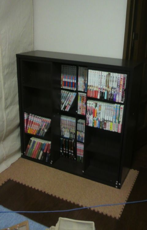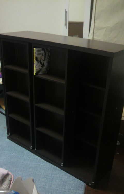 本棚でした。両面スライド式大容量を謳うお値段3980円の本棚です。とってもお得だと思ってます。